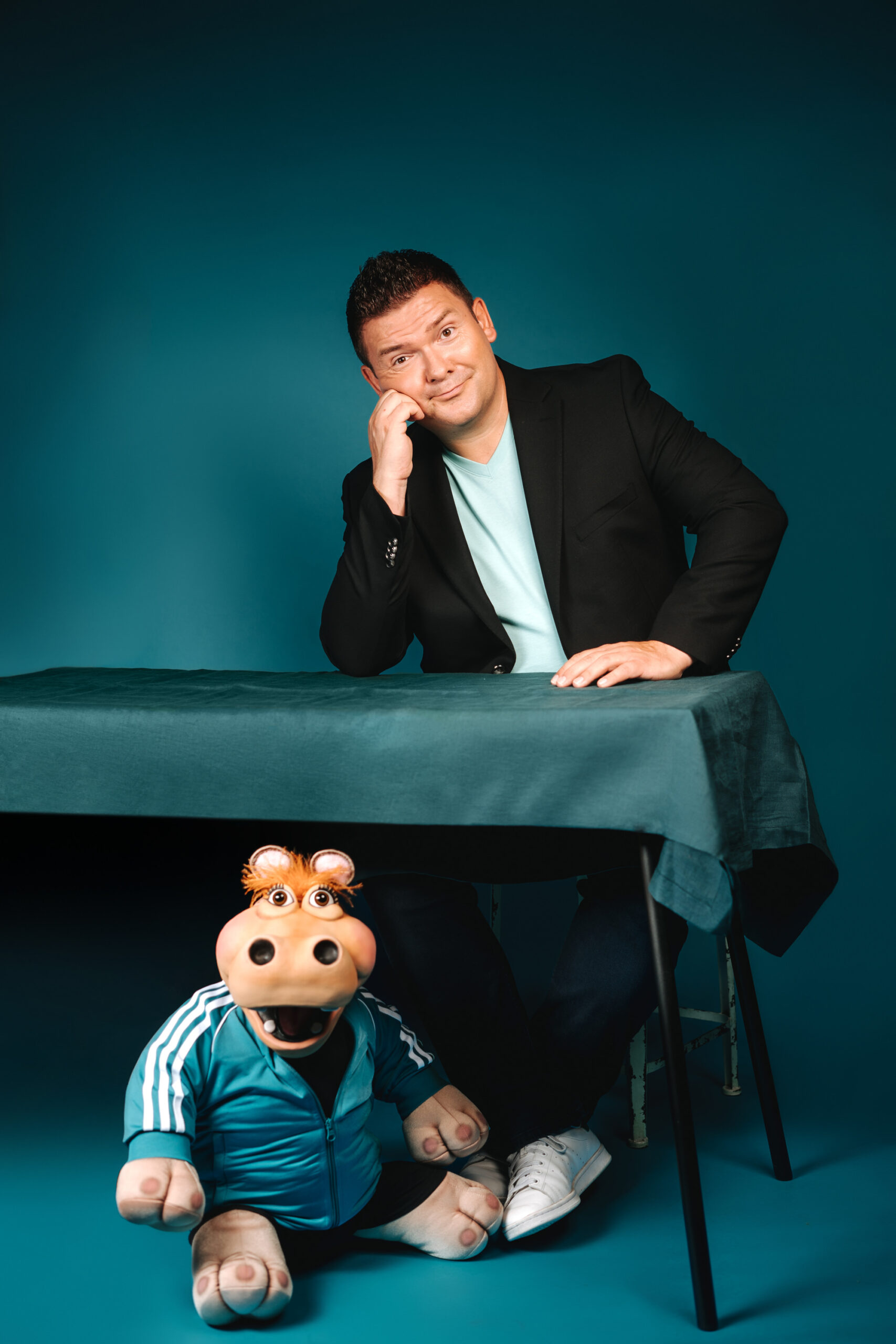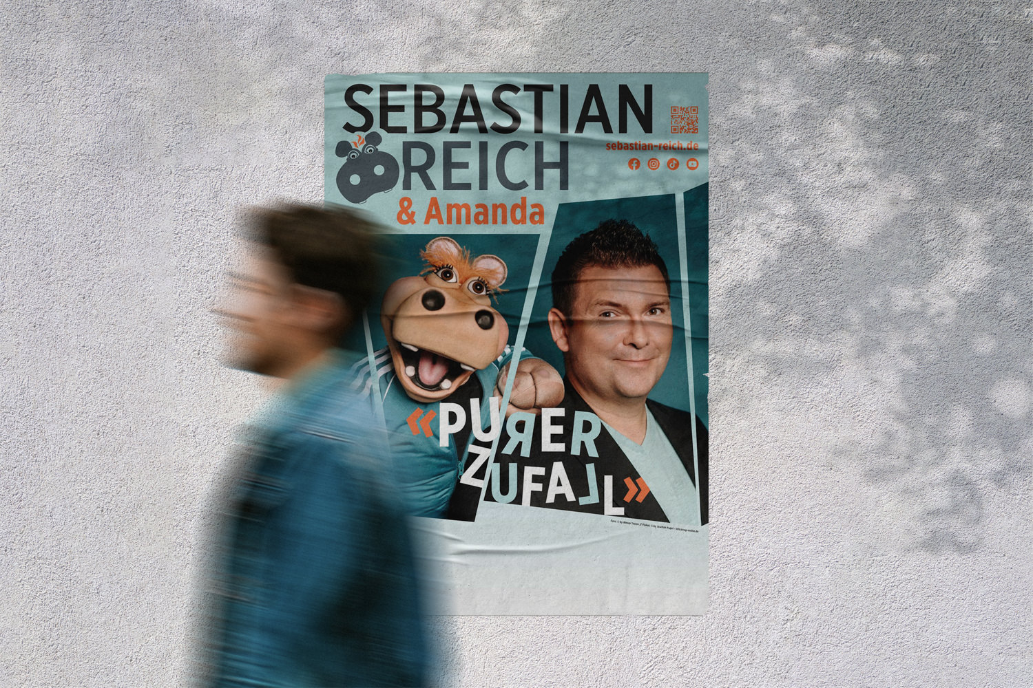 Wenn ein Comedian mit einer sprechenden Nilpferddame auf Tour geht, dann darf auch das Plakat nicht leise sein. Für Sebastian Reich entstand eine Serie von Portraits, die Humor, Timing und Persönlichkeit gleichermaßen vereinen. Die Fotos bilden die Grundlage für das Tourplakat, Pressebilder und alle Kanäle, auf denen Reich sein Publikum erreicht.